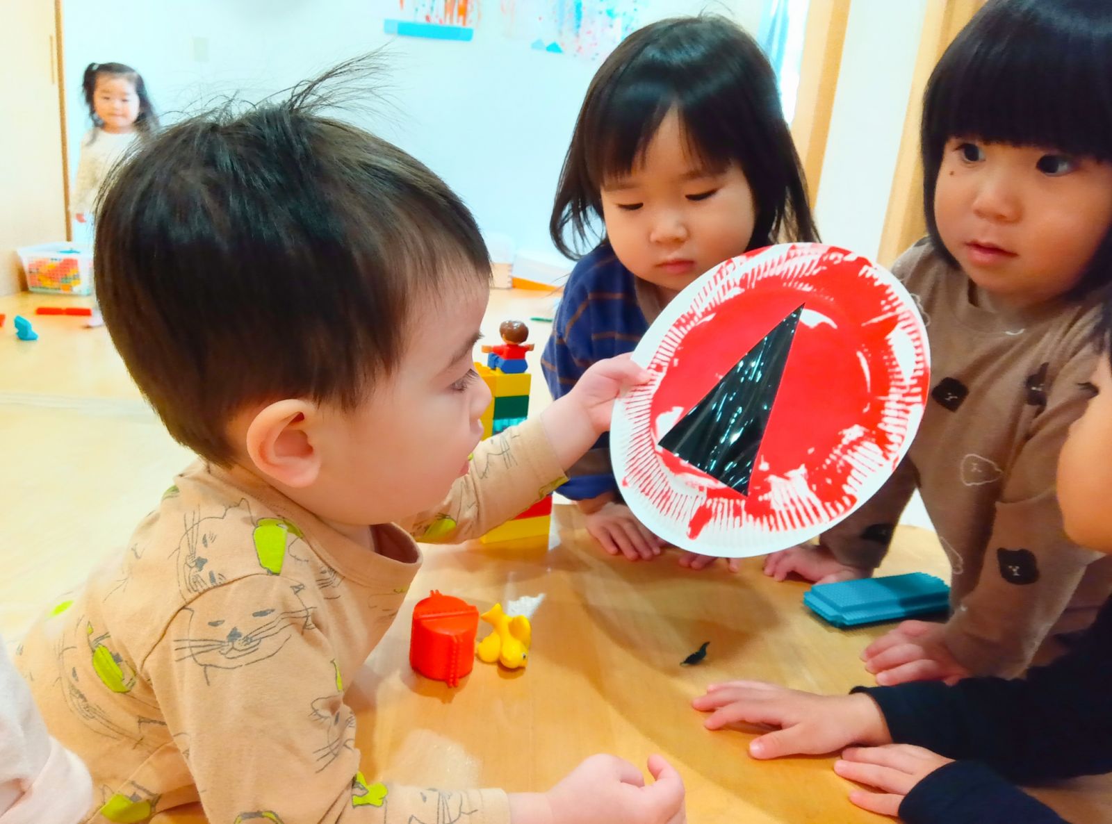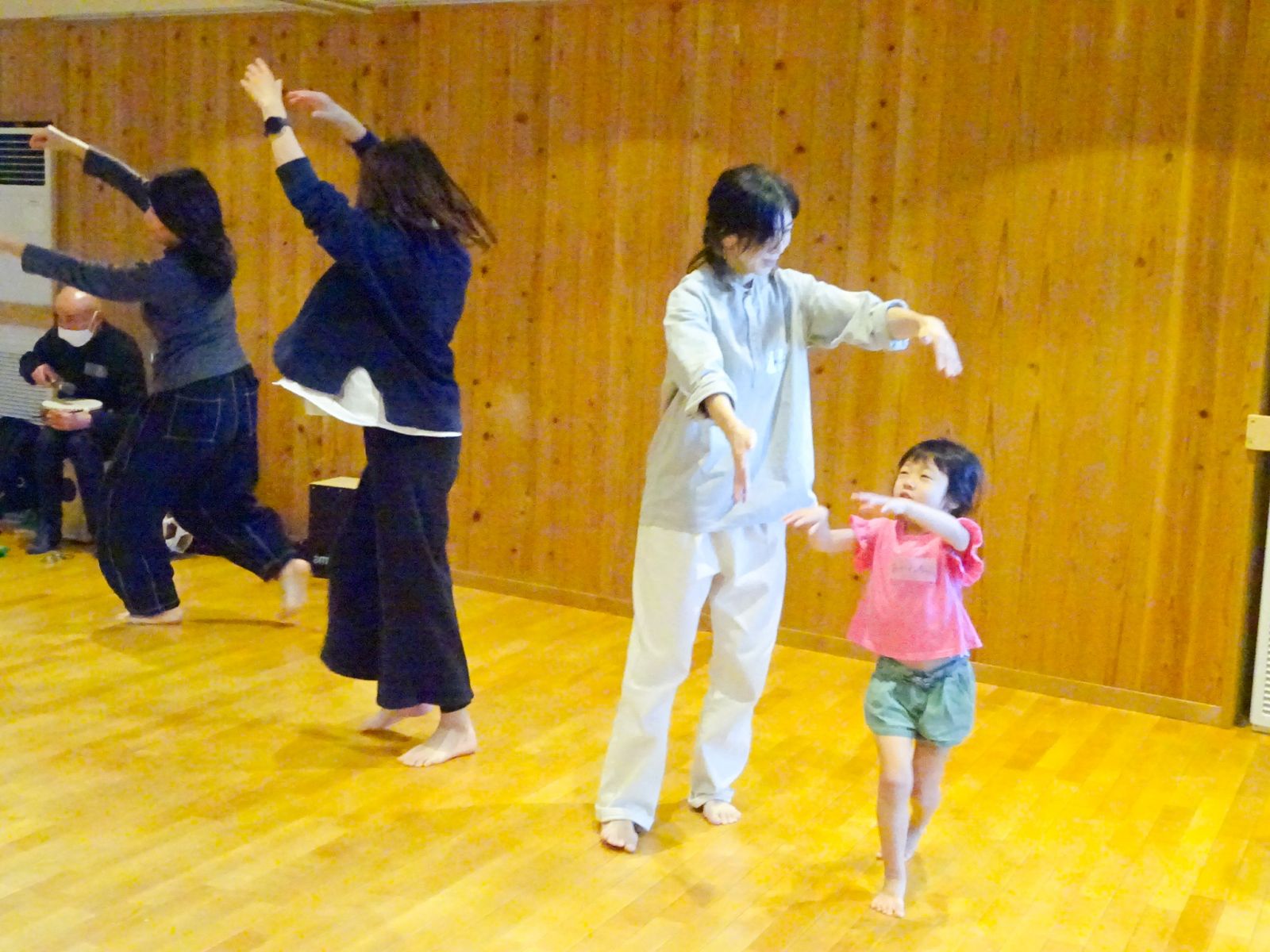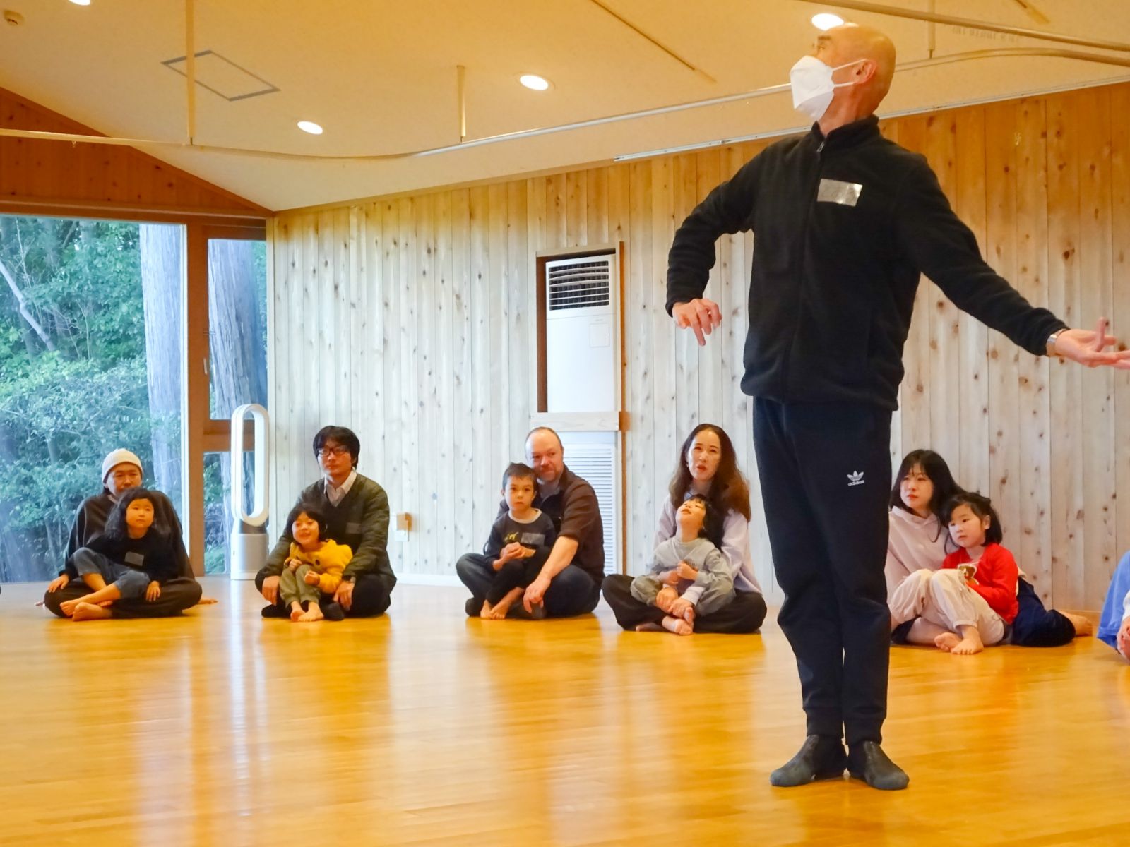 認可保育園こども芸術大学ならではの取り組みとして、親子で一緒に活動する「創作の時間」があります。廃材や瓜生山の自然物など様々な素材で制作を楽しむことが多いのですが、今回は打楽器のリズムを感じながら身体で表現するものでした。年長・年中児となると他の人の気持ちや視点を理解し始め、自分が「周りからどう見られているか」を意識するようになります。他人と違うことや失敗を恥ずかしく感じ、照れ笑いをしたり、ふざけたり、動けなかったりするのですが、お父さんやお母さんの指先だけのふれ合いや優しく抱かれることで、徐々に心と体が心地よく解放された素敵で不思議な時間でした。