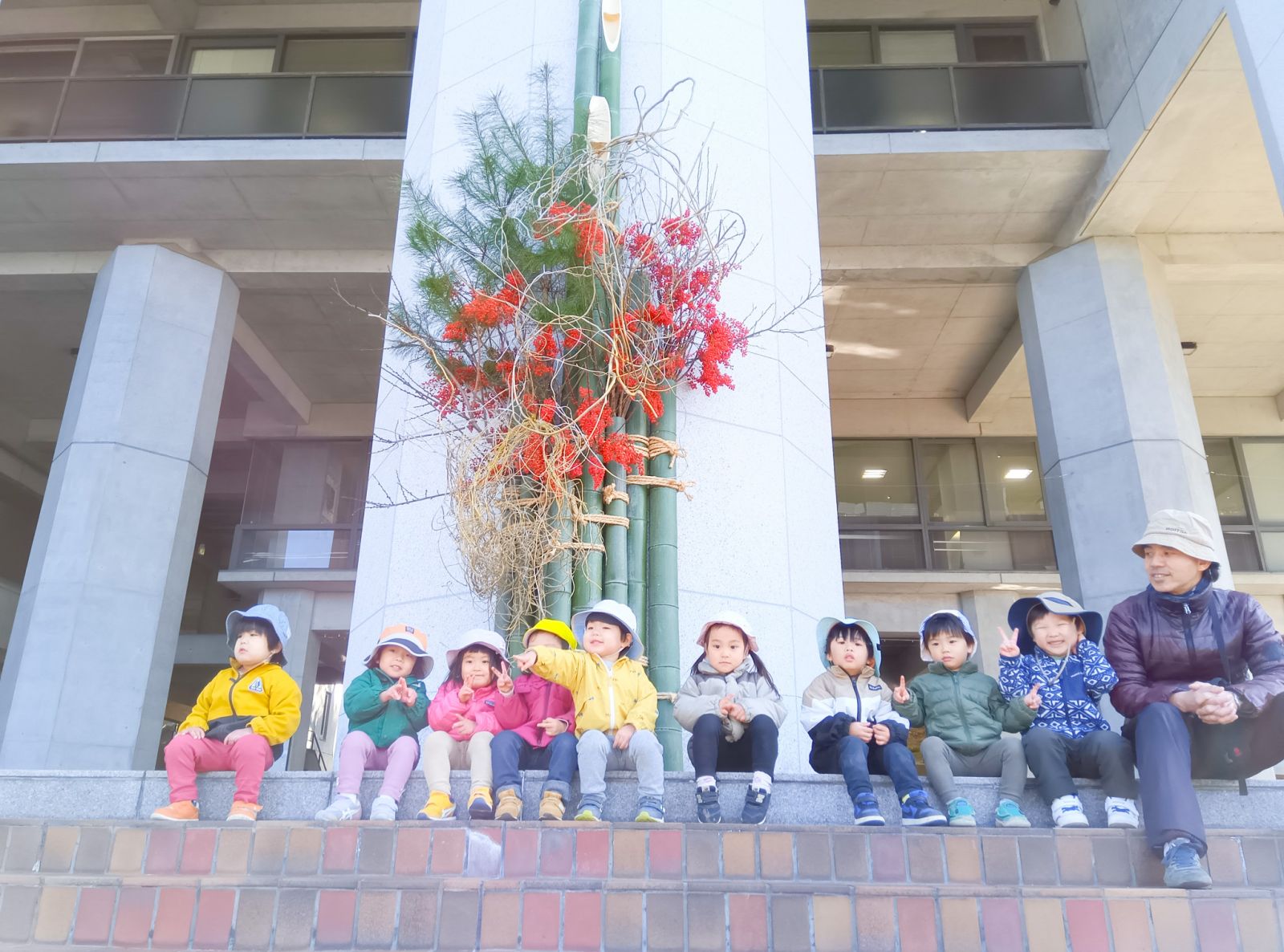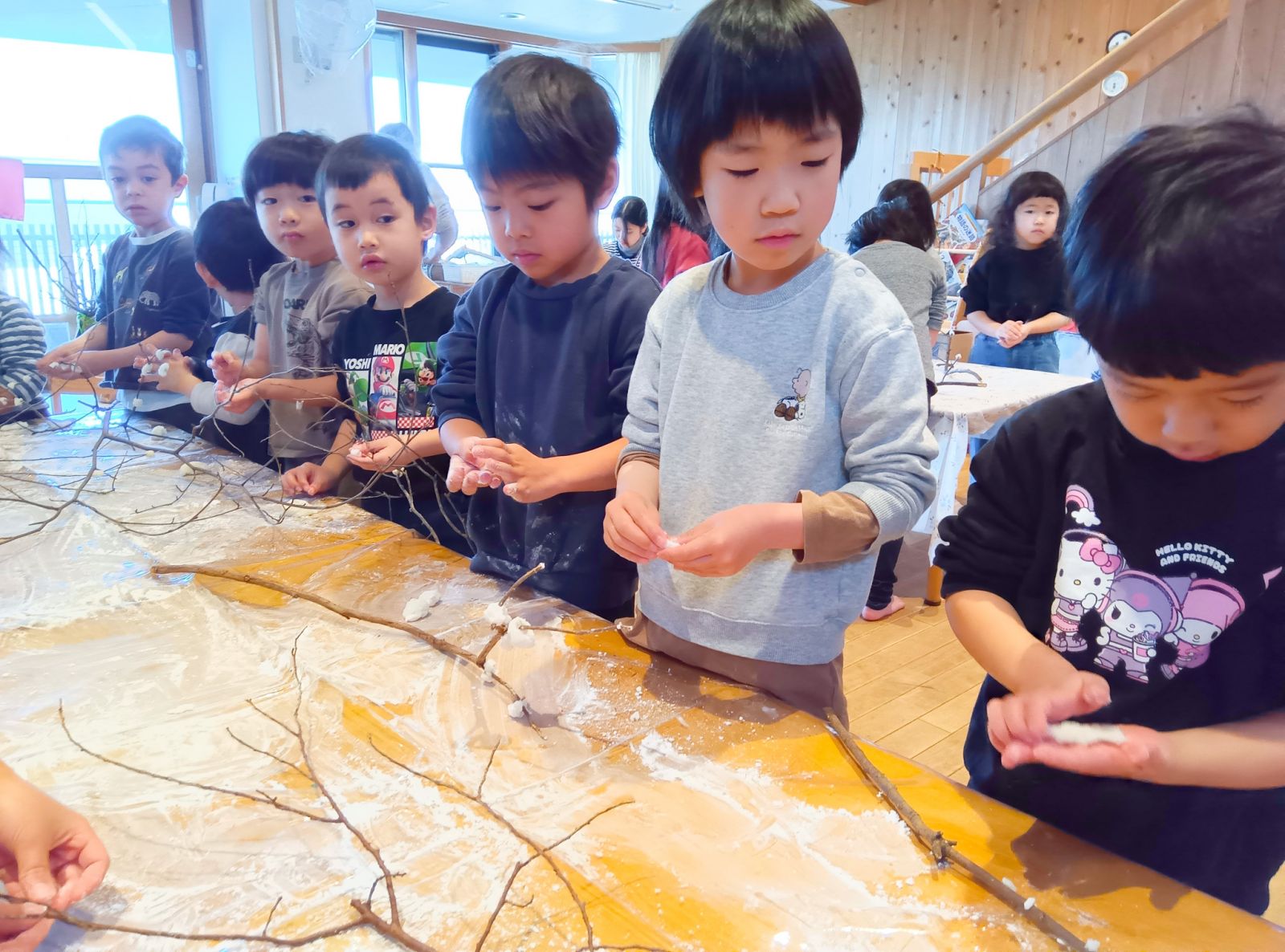 みんなが揃うと早速お正月の行事がありました。幼児クラスのこどもたちは、瓜生山から手ごろな枝を集めてきて、赤く染めた柔らかい餅と白い餅を枝に付けて餅花を作りました。まるで梅の花が咲いたようなきれいな枝を各保育室に飾りました。今年はたくさん餅花が作れましたので、学園内へもお裾分けに…こども芸術学科、高校、施設課などへご挨拶とともに餅花を届けに行きました。突然の訪問にもかかわらず、行く先々で優しい声を掛けてもらいこどもたちは大喜び。保育園を代表して餅花を届けることができた達成感にちょっぴり誇らしげな表情をしていました。