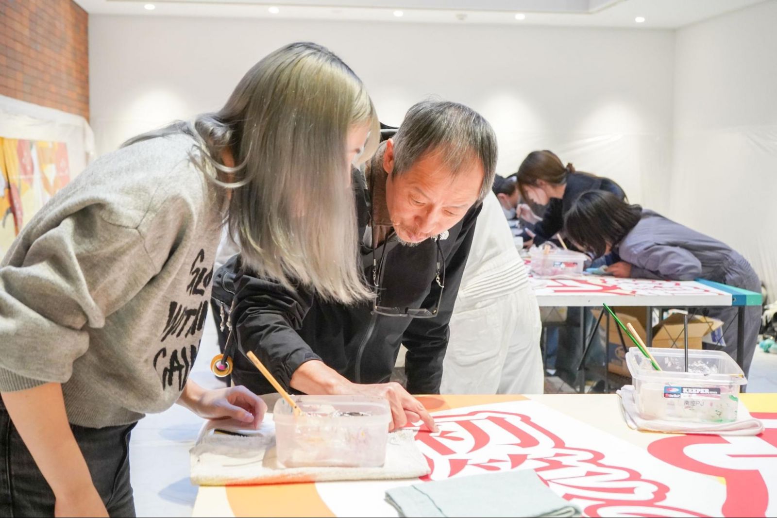 その後、制作班の学生ひとりひとりに担当範囲が割り当てられ、学生自らが手を動かし、筆で色を塗っていきます。もちろん、一度塗りで終わることはありません。全体を俯瞰しながら、何度も色を重ね、完成まで作業を進めていきます。