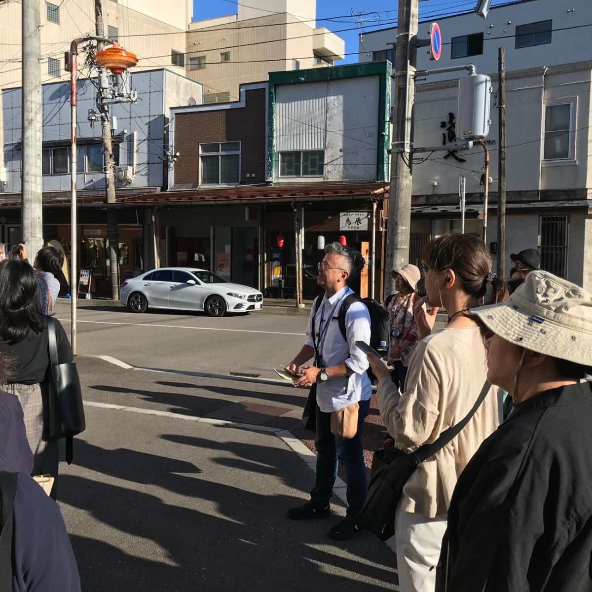今回のミニレクチャーでは、そうした行政主導による対策というよりも、とくに市民による保存・継承の試みに焦点を絞って事例を紹介していただきました。その特徴は、町中に点在する歴史的な価値をもった古い家屋や商店のような建物をまるでタイムカプセルに閉じ込めたかのようにそのままの姿で後世に残すことではなく、人が住み生活する場としての機能を重視して、時によっては建物等に手を入れることも検討しながら保存・継承するというものです。こうした取り組みにかんする説明をいくつか受けた後で、函館コミュニティプラザGスクエアのある本町から伝統的建造物群保存地区がある元町へと市電で移動し、現地で野村教授から実例を見学しながら保存・継承にかんする解説を聴講しました。