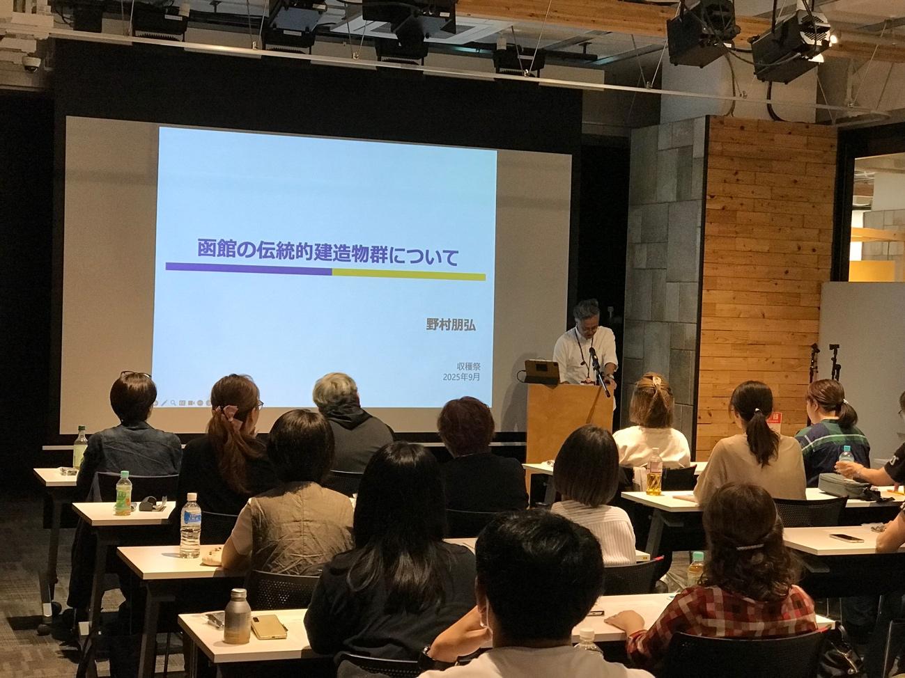 2025年9月27日(土)に北海道函館市で収穫祭を開催しました。収穫祭は通信教育課程の在学生、卒業生、教職員の交流の場であり、全国各地の芸術文化を現地で学ぶための場として日本各地で毎年実施しています。今回は20名の在学生と卒業生が参加し、函館市における重要伝統的建造物群の保存および継承に関するミニレクチャーを聴講した後に、町中に出て保存活動の現場を見学しました。その様子をご紹介します。