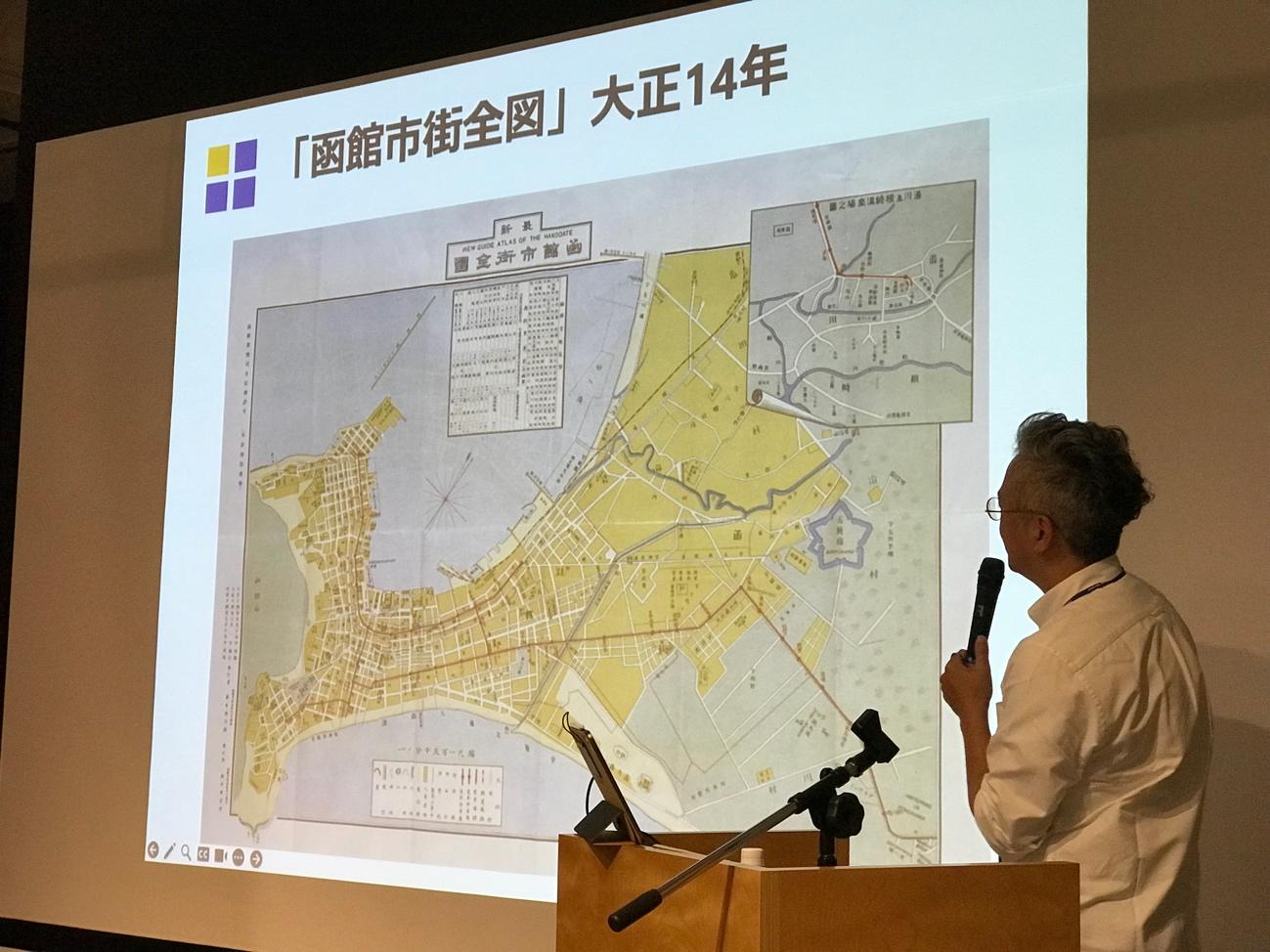 函館市本町にある函館コミュニティプラザGスクエアにおいて13時から始まったミニレクチャーについて最初にお話ししましょう。レクチャーの担当者は本学通信教育課程芸術学科長の野村朋弘教授です。同地のご出身である野村教授から、まず函館という町の特異性について、古地図やさまざまな映像資料を用いながら歴史的・地理的視点からの説明がありました。