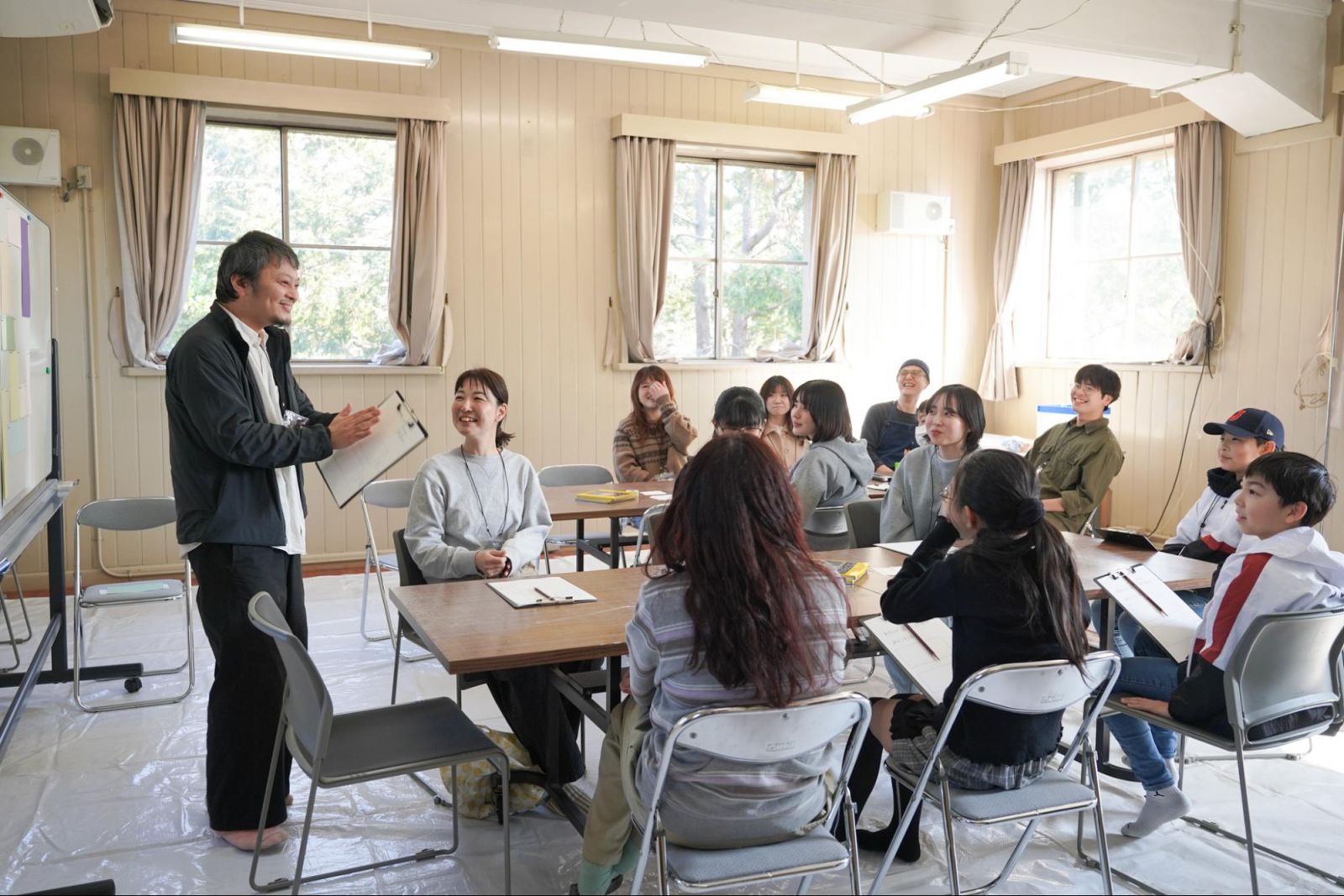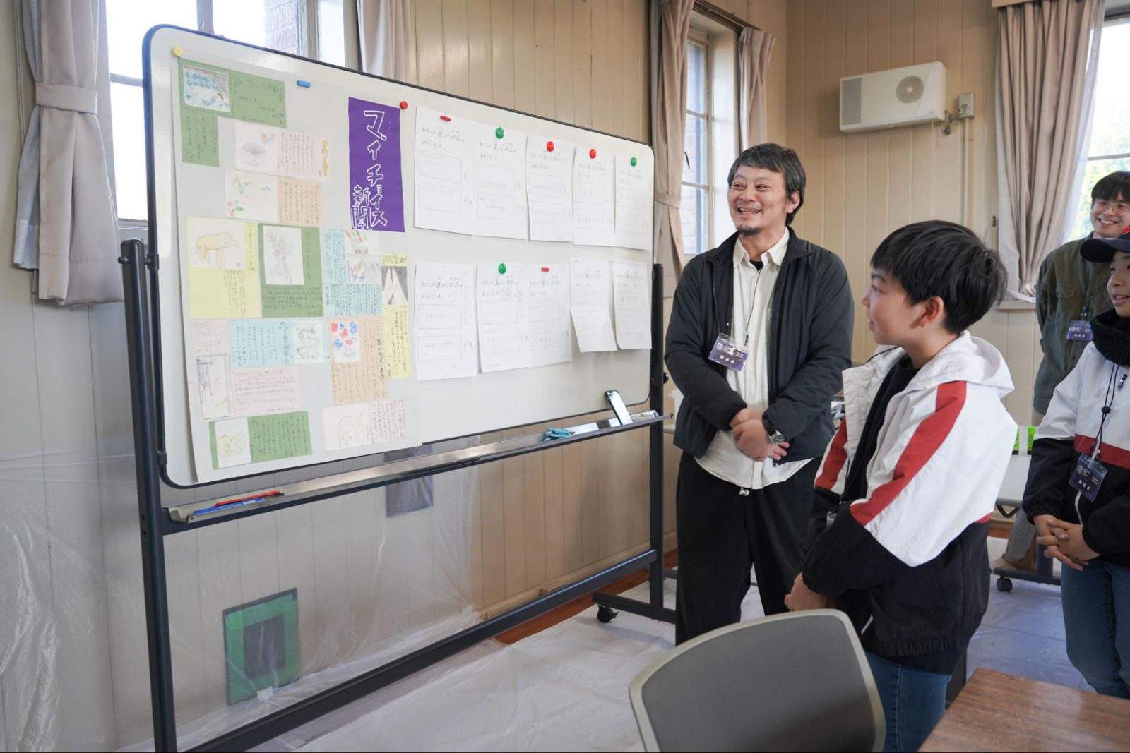 午後からは、また異なるイベントが始まります。メンバーの顔ぶれも変わり、画材はすっかり片づけられていました。代わりに目を引いたのは、プリントが挟まれたバインダーと、ホワイトボードに貼られた大きな紙。