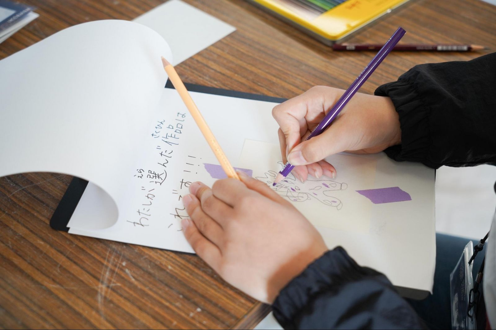 鑑賞を終え、技術資料参考館に帰ってきた後は、記事を書いたり、絵に色をつけたりしていきます。会場には、アートクラスでオレンジ色が好きだと言っていた子が。「ここ、どんな色だったっけ……」「え、たしか暖色だったんじゃない?」そう学生スタッフが補助すると、「あれ、また暖色だ」と気づきます。自分の好きな理由の一つに気づきながらも、絵と記事を仕上げていきます。