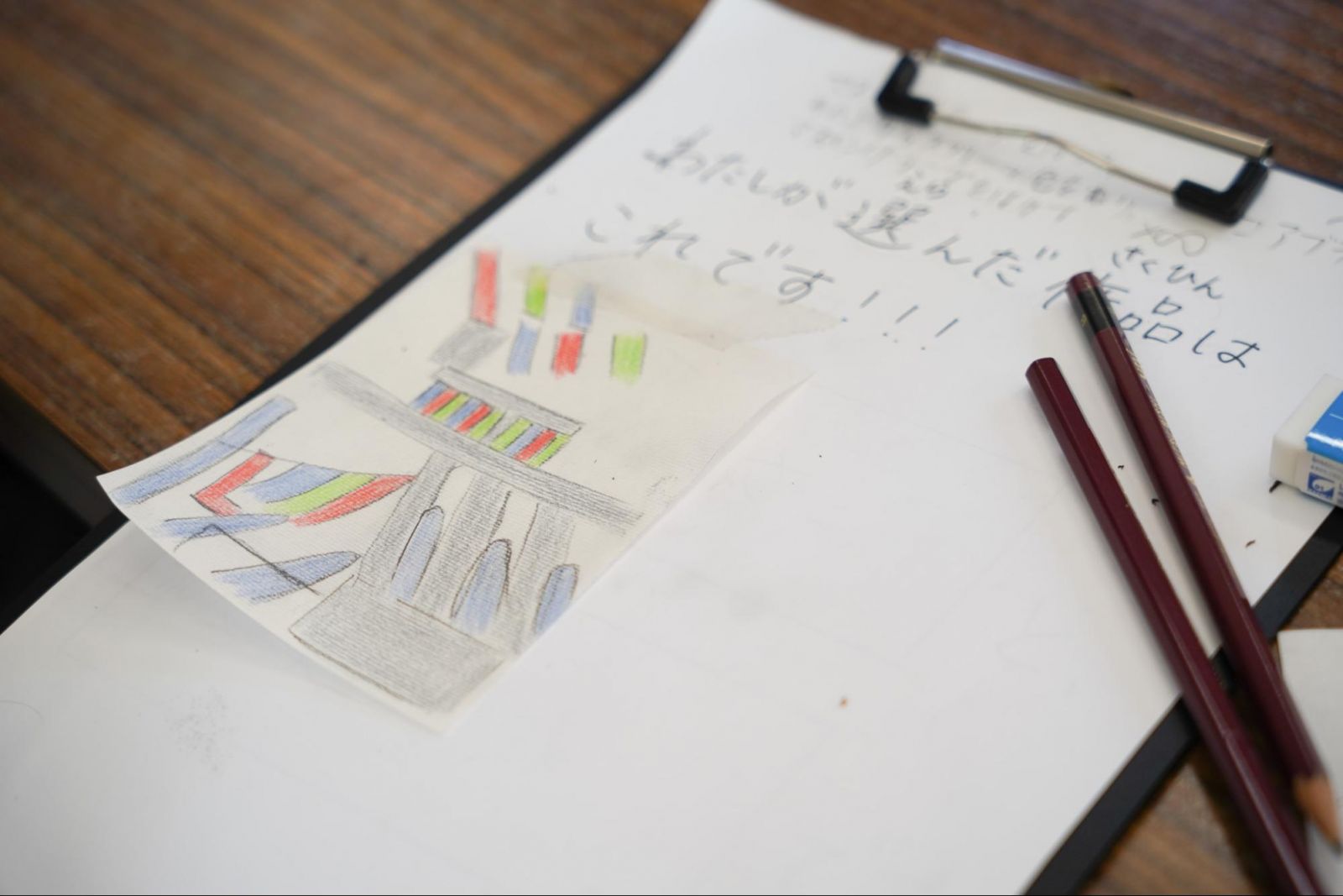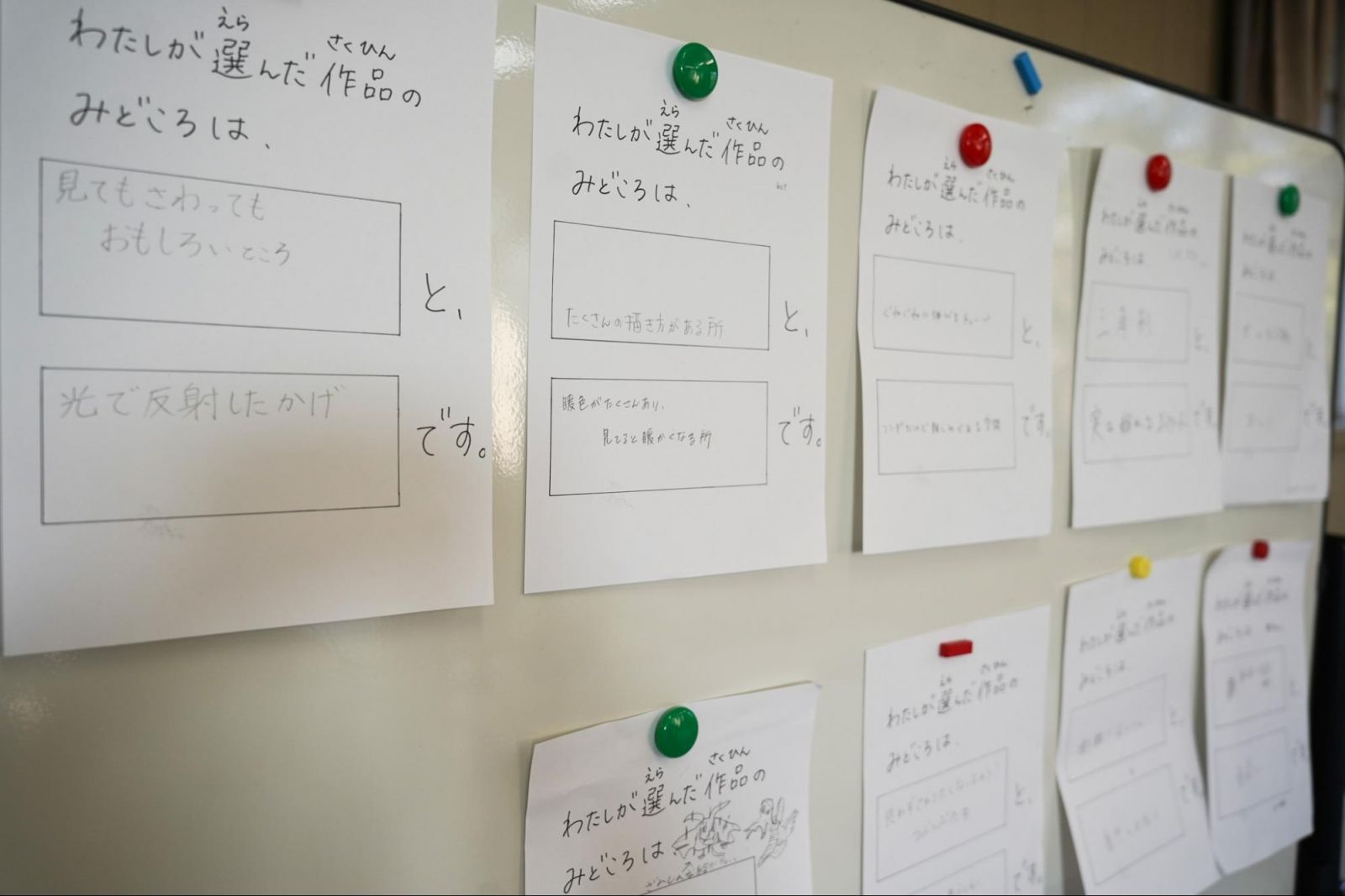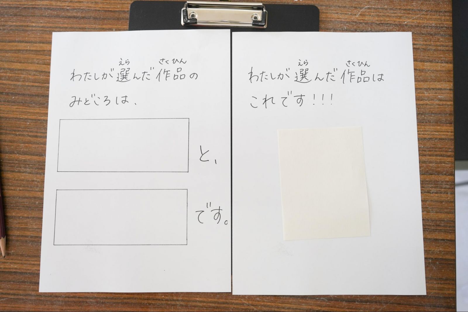 子どもたちの手元に置かれたバインダーには、作品の“好きなところ”を2つ書くための用紙と、作品のスケッチをするための紙が挟まれていました。新聞に欠かせない“写真”の代わりに、自分の視点で作品を描き、魅力を伝えるのです。