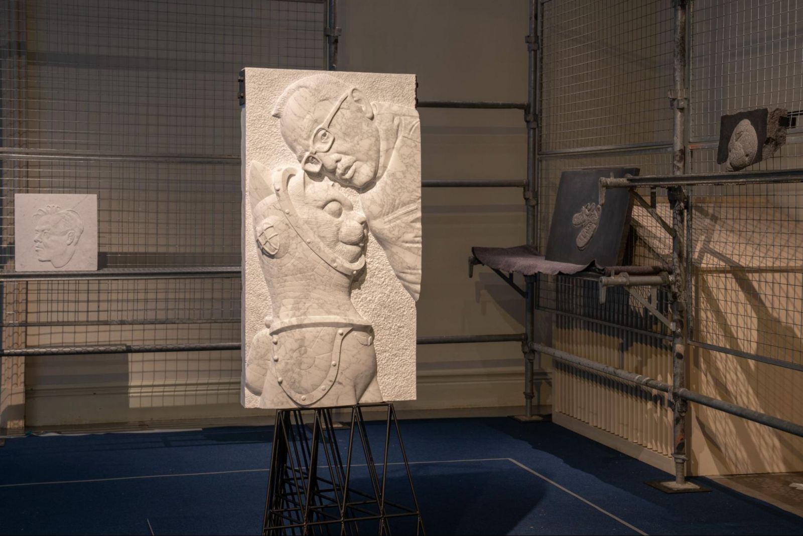 小笠原は、古典的な石彫彫刻のカリキュラムが大学からなくなるなか、不要になった石材を譲り受け、多くのレリーフを制作してきた。芸術作品というよりも、人々が原始的に求める肖像レリーフのようなものであり、社会と結び付く職人的な在り方を求めている。今回は、後輩であり、AFKにも出品しているアーティストの米村優人が、50代になったときの姿をAIでつくり、それを彫ったり、抽象彫刻の中間形態として、誰もが日常的に食べるシュークリームのレリーフ、さらに自分が長年履いていたくつを、学生がトレーニングする鉛筆デッサンのように彫って作品にした。そしてもっとも巨大な作品として、推薦人でもあるヤノベケンジと、代表作である《SHIPS CAT》を彫った。生活の中でどのような石彫が求められるのか。小笠原の探求は続く。