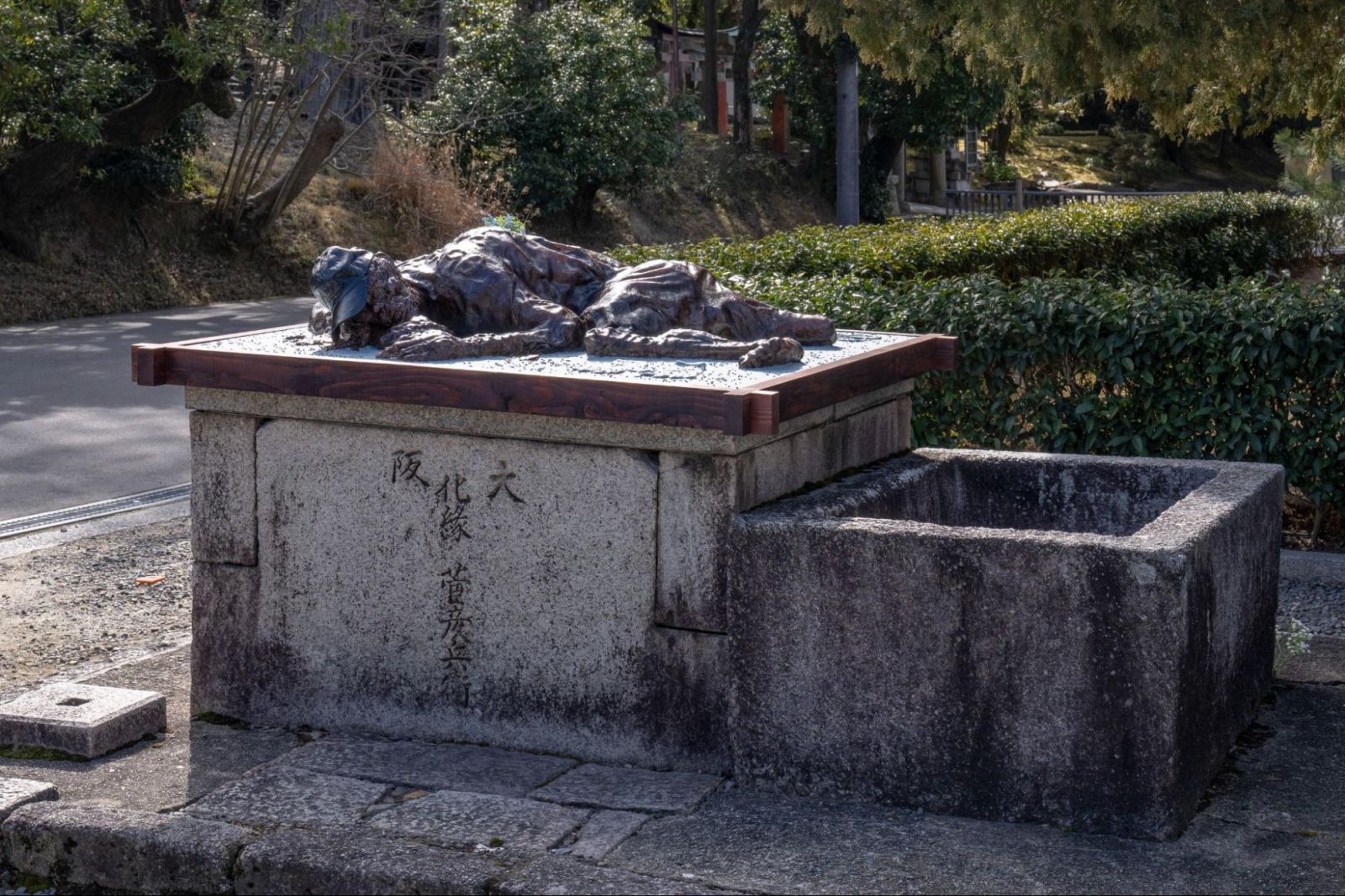 ニーチェの「超人」とは異なるが、信仰がなく生き続けるのは難しい。彫刻に例えると、ギリシア神話や聖書のモデルといった規範がない状態で、人体彫刻をどうつくるかは同様に困難を極めるだろう。ただ、「彫刻」といっても、単純に石や木を彫るわけではない。服や木材、ガムテープなどさまざまな素材をFRPで固めて塗装したりする。削るより加える立体作品である。今回は、東福寺会場の二か所に、かつて無数にいた路上生活をする人や、その逆に現在、大量にいる旅行者などをモデルに、人と彫刻における公共性、あいまいな共存をテーマに展示した。公共彫刻の人物像はある意味で理想化された「超人」といえるが、そうではない形態での、新たな公共における人体彫刻の可能性を追求している。