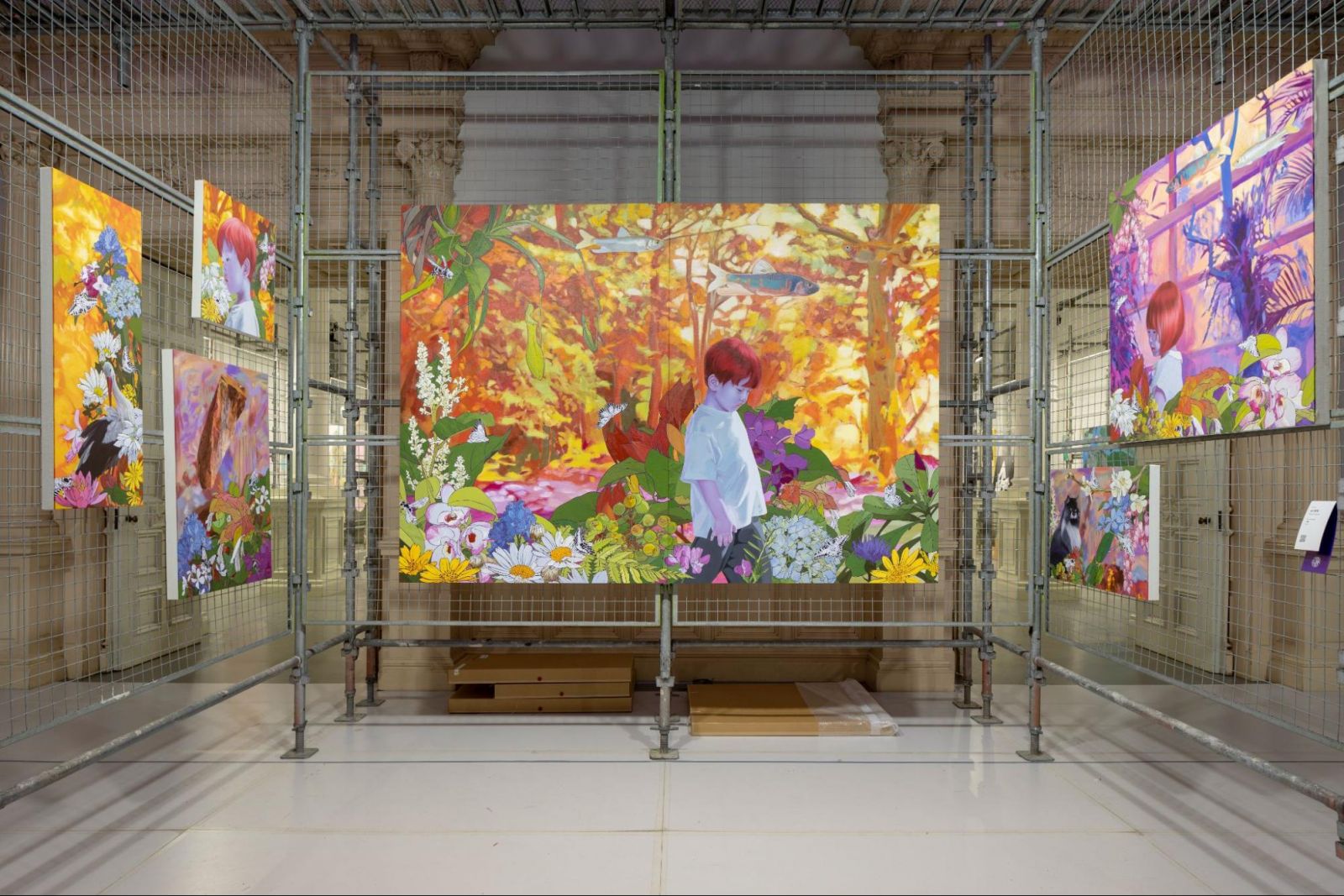 興味深いのは、ジョサイア・コンドルの最初の弟子のひとりであり、 宮内省所属の建築家、片山東熊の設計で、サロンが開催されていたルーヴル美術館などに代表される、バロック様式を基調とした宮殿建築の博物館に、現代の絵画や彫刻、インスタレーションが空間を覆うように展示されていることだろう。言わば日本の美術がFINE ART(美術)として、生活から切り離されたきっかけとなった空間でもある。逆に言えば、そこからやり直そうという意思表示とも見て取れる。