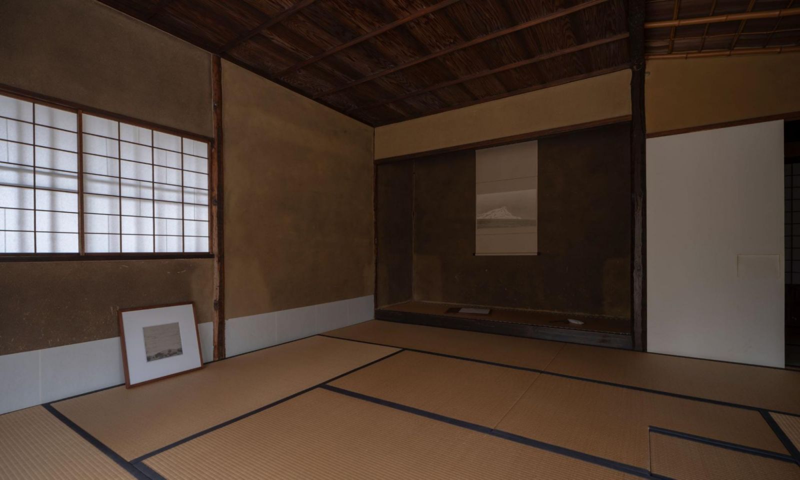 京都国立博物館会場で特筆すべきは、近代建築とは真逆の茶室「堪庵(たんあん)」であろう。江戸時代初期に数寄屋造り建築の一部として建設され、1958年に博物館に寄贈された。「堪庵」では特別展として、品川亮(大学院芸術研究科 芸術表現専攻修士課程修了)の展覧会「ひとの多い方へ」が開催された。