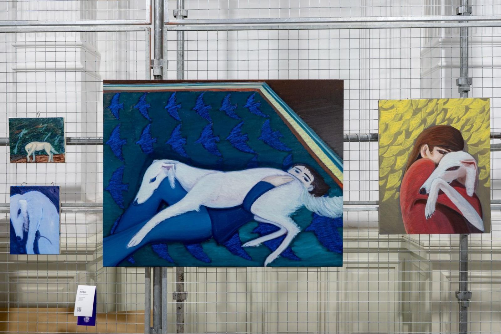 白石効栽(大学院芸術研究科 芸術専攻修士課程修了)は、韓国の釜山で生まれ、幼い頃、長野県で過ごし、大学と大学院を京都芸術大学で油画を学んだ。現在は、特徴的な白い犬をモチーフに連作を描いている。時に政治的な対立を生む両国に挟まれることもあるため、どのような政治的なものからも逃れた「土着性」を描くために、自身の肖像画を選んだ。しかし、髪型や肌の色など、どうしても細かな自身の特徴が気になるため、釜山から連れて来た釜山犬の愛犬を代わりに自身の投影として描くことにする。愛犬も白石と同じ身で、言葉や環境が合わなかったのか、寂しい思いをしていたという。