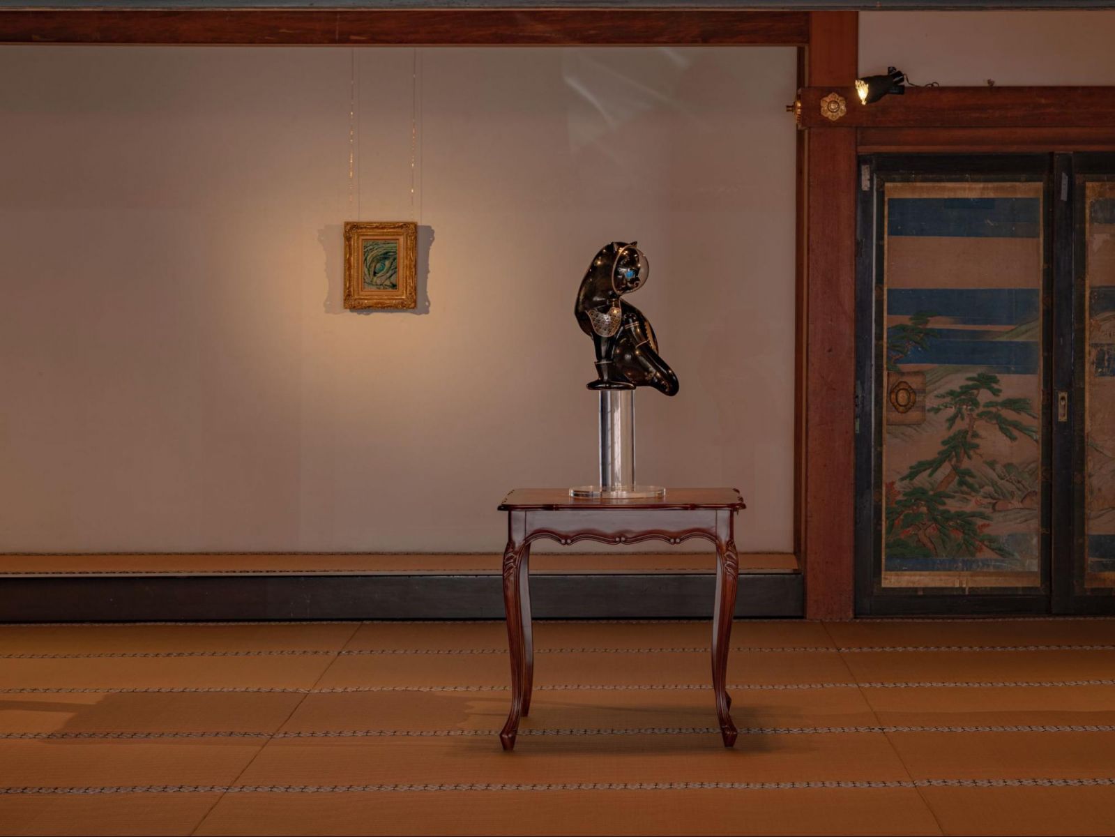 奥の床の間の前には、ヤノベケンジの《SHIP’S CAT》に漆芸を施すシリーズで、初めての見返り猫タイプ《黒漆天廻昇龍》(2026)が置かれ、背中から龍が昇る蒔絵が描かれている。法雨(ほうう)を降らせるために、禅宗寺院の天井に龍が描かれるように、猫が修行する人々を見守り、天に昇る龍を誘っている。