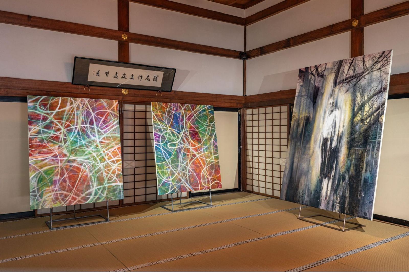 特に、メインの床の間には、旅先でスケッチしたセザンヌが描いたサント・ヴィクトワール山を墨で描き、畳床には旅先でのりんごをモチーフにした絵を置いている。もう一つの床の間には、縦長の和紙に、雨の絵を描いた。雨は、旅の足止めとして一般的には嫌われるが、「晴耕雨読」として前向きに捉え、畳床には、小さな書見台に本という形式の原点である「聖書」を置いた。古今東西のアーティストの技能や文化を旅をするように自由自在に往還している。