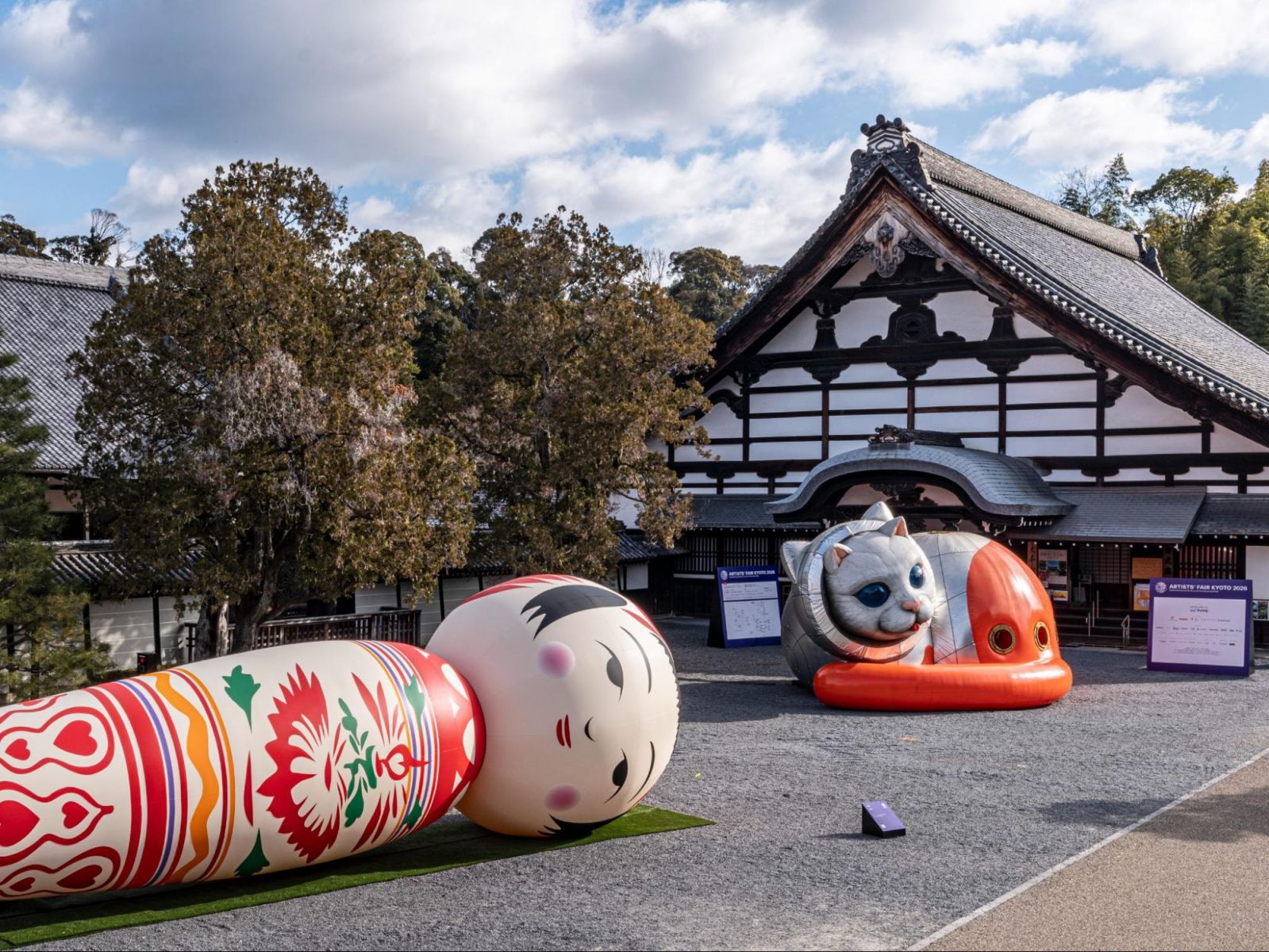 また、例年、Yottaの巨大こけし人形《花子》(2011~)を寝かした涅槃像が、AFKのシンボルのようになっているが、今年はその横にヤノベケンジが、バルーン製の眠り猫タイプの《SHIP’S CAT》像である、《宇宙猫涅槃像》(2026)を展示した。Yottaとのコラボレーションは、2年前の清水寺会場以来となる。