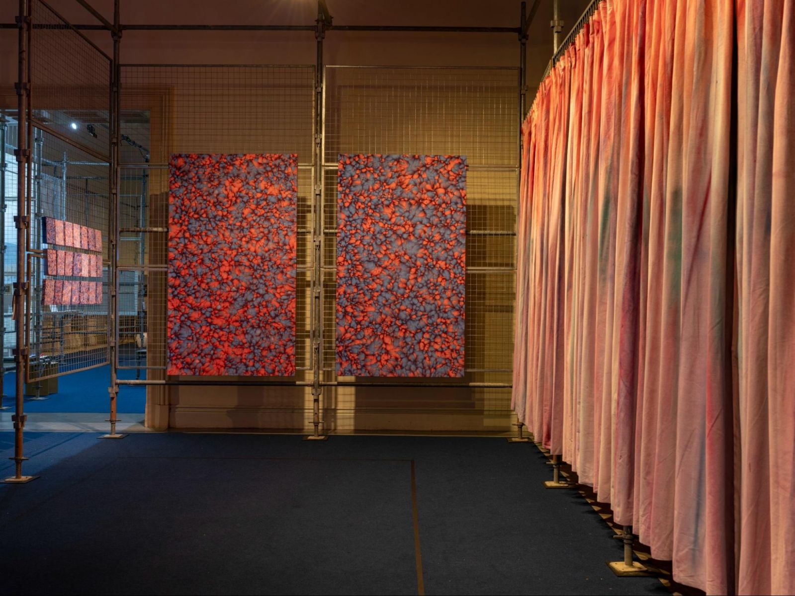 赤と青が対照色相であるため、印象派に多大な影響を与えたミシェル・シュヴルールの指摘する「同時対比」と視覚混合の効果で、画面はチカチカとさらに輝きを増していることもその要因であろう。広田は8畳ほどの小さなアトリエで制作を行っており、広げられた布は、いわば広田の被膜といってもよいかもしれない。今回新たに全長17メートルに及ぶカーテン状の作品を制作した(今回は9メートルに収縮させて展示)。2メートル程度に折り畳んだ状態で、スプレーを吹き付けたり、絵具をかけたりしながら、複数の色を重ねていく。