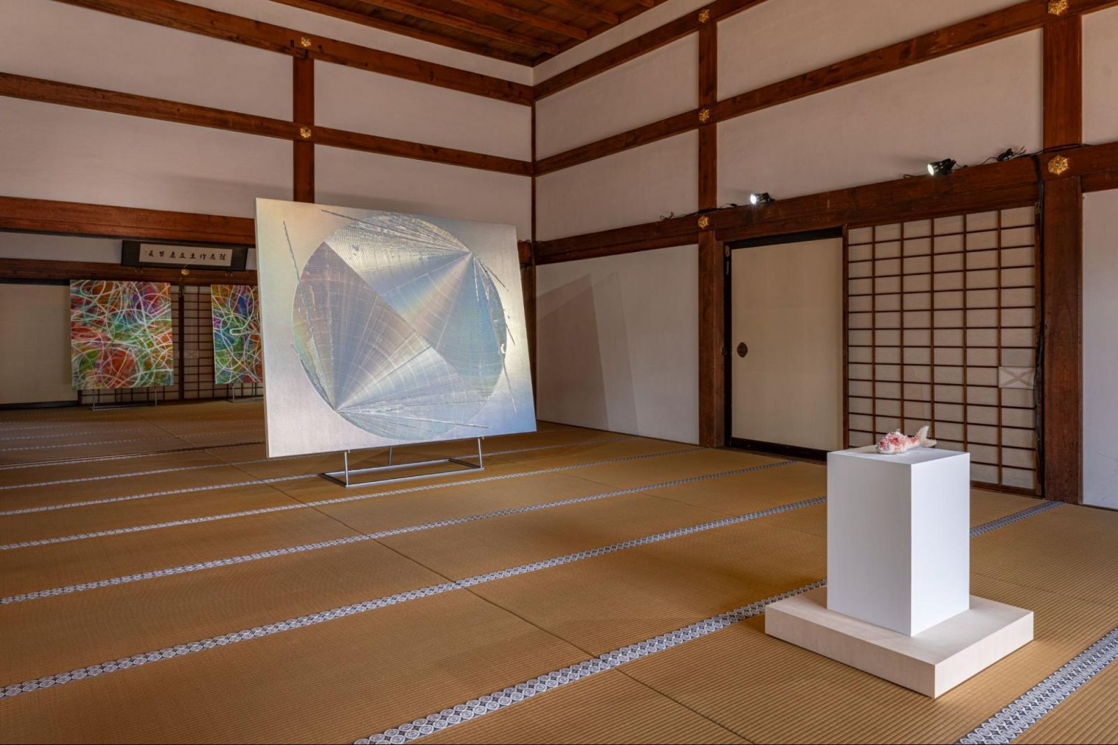 方丈に入ると、手前にはオブジェクトを透明の球体で覆う、名和晃平の代表的シリーズ《PixCell》から、鯉のオブジェを透明の球体で覆った作品《PixCell-Carp#9》(2025)が展示されている。それは重森三玲が作庭した「八相の庭」の南庭に広がる枯山水に、想像の池をつくって泳がすことを意図しているといえる。その奥には、中心軸から光輝性の絵具をスキージで回転して円形を描いた大庭大介の《M》(2025)が、外光を反射して輝いており、「八相の庭」の「砂紋(さもん)」と照応している。その裏側の空間に展示された、鬼頭健吾の《star cluster》(2026)も色の重なりの中に、白いフープの軌跡が反復しており、水の波紋のようである。禅が有から無に還る行為だとしたら、池田光弘の作品《afterimage/ghost no.1》(2026)は、無から有にイメージが生まれる過程を定着させているといえるだろう。