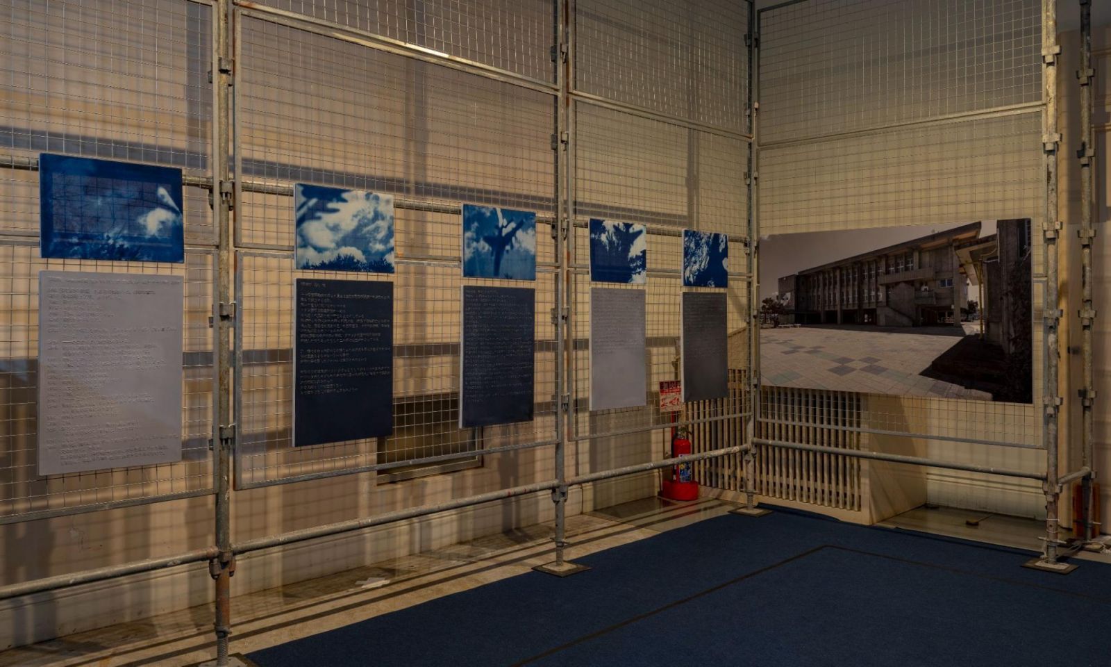 向い合うように展示された小学校の絵画と写真の間に、アメリカの公文書館で公開されたパイロットと通信官の会話の翻訳や、体験者の記録集の文字を刺繍で縫い込んで、上からグレーの色を塗った絵画に仕上げた。絵画の上には、墜落した戦闘機F-100Dジェットのプラモデルをつくり、落ちていく様子を、再演して写真を撮影したものから、青焼きにした。まさに、記憶の中で焼き付けられたイメージであり、反芻される文字といってよいだろう。伊地知は、アーティストでしか表現できない社会的事件が、個人の心の中に及ぼす影響を形にしているといえる。