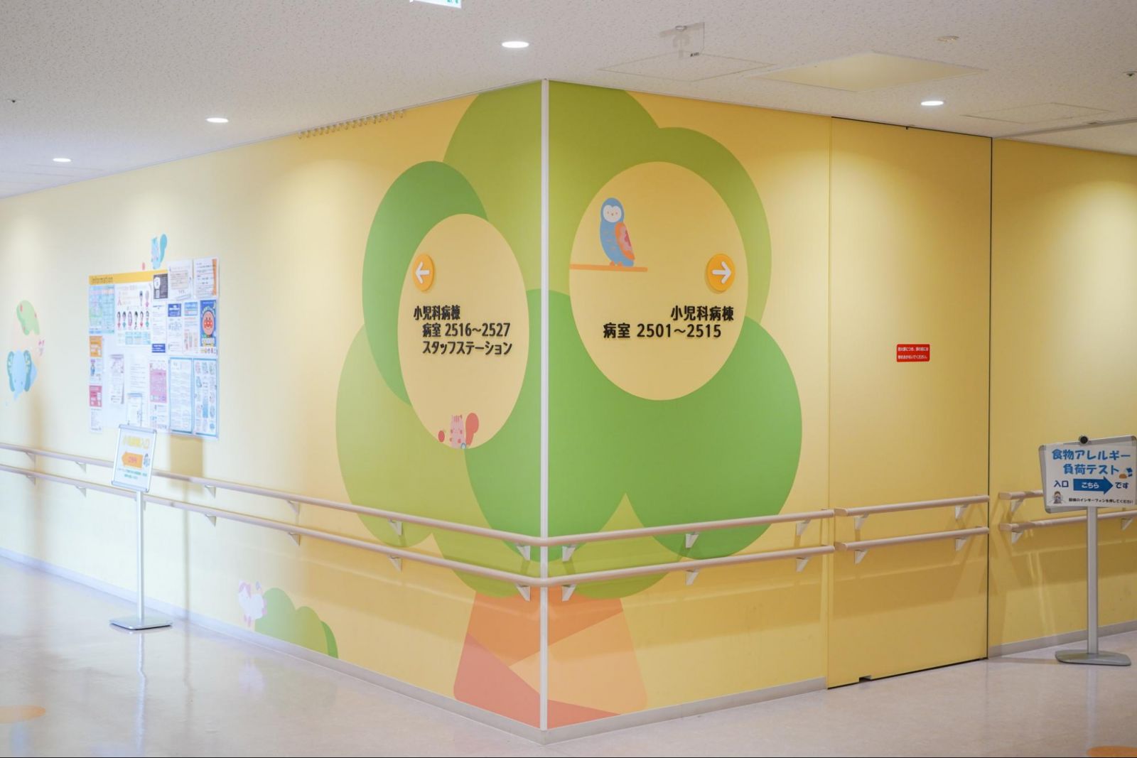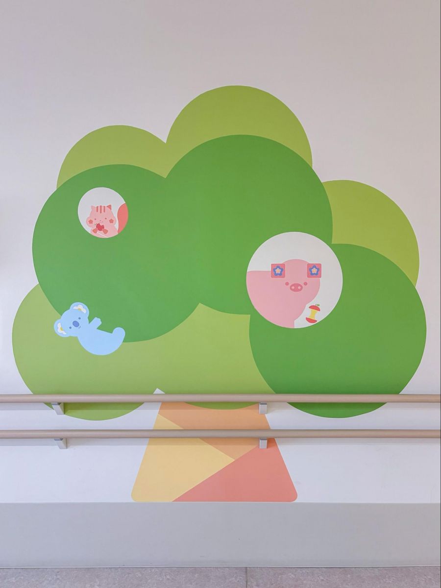エレベーターを降り、小児科病棟のフロアで一番最初に目に入る大樹のイラストは、療養中の子どもたちのための絵本やおもちゃの置かれた院内のプレイルーム「わくわくるーむ」と世界観をともにするもの。