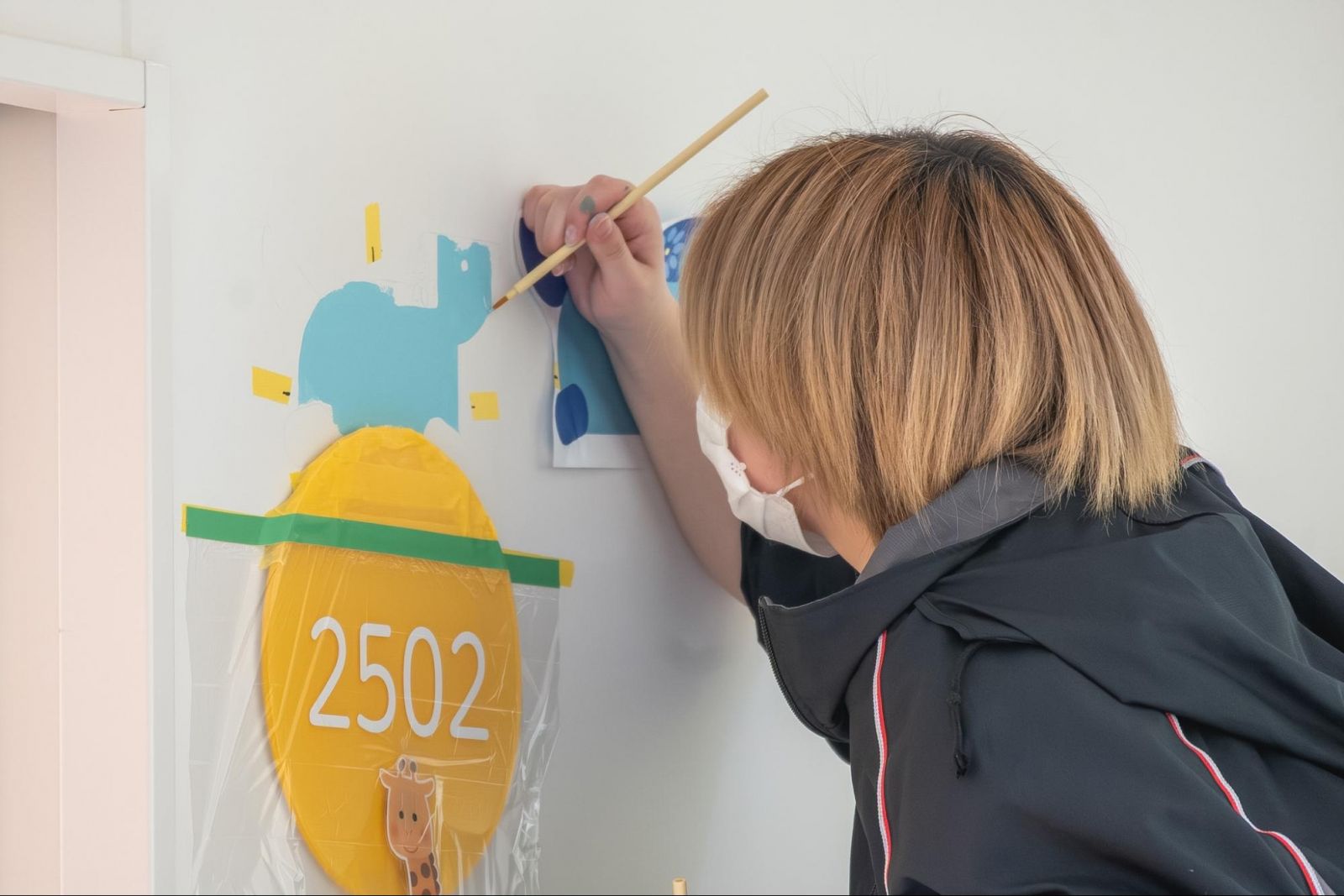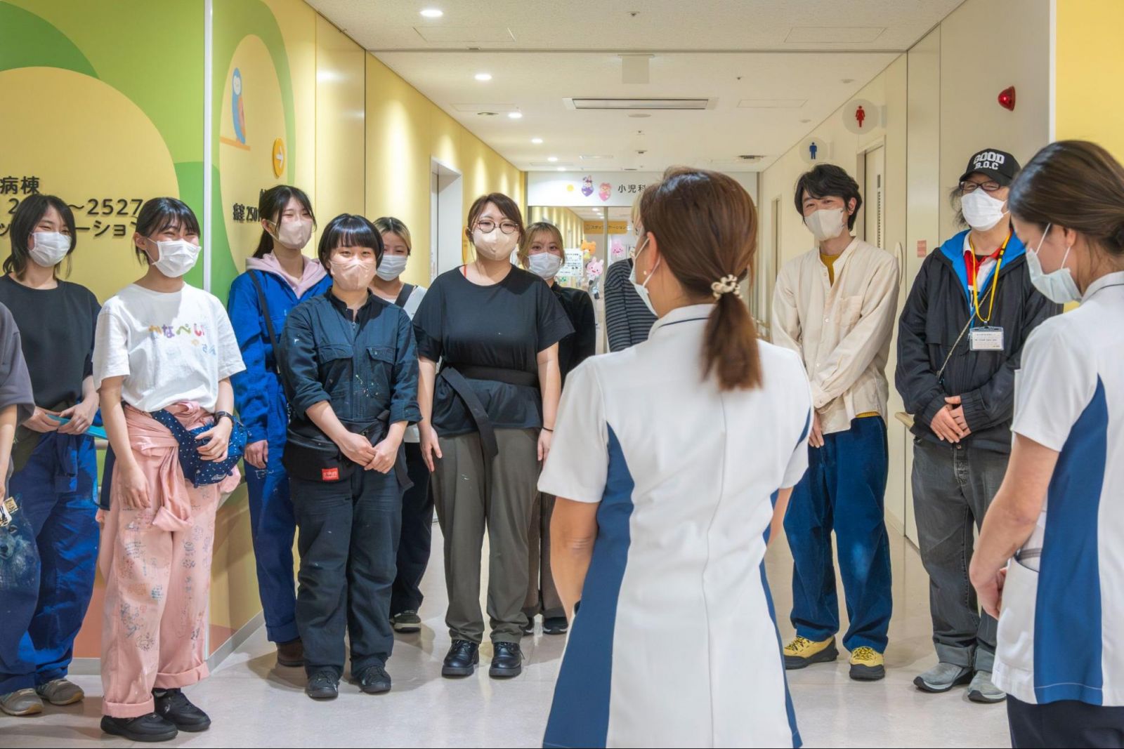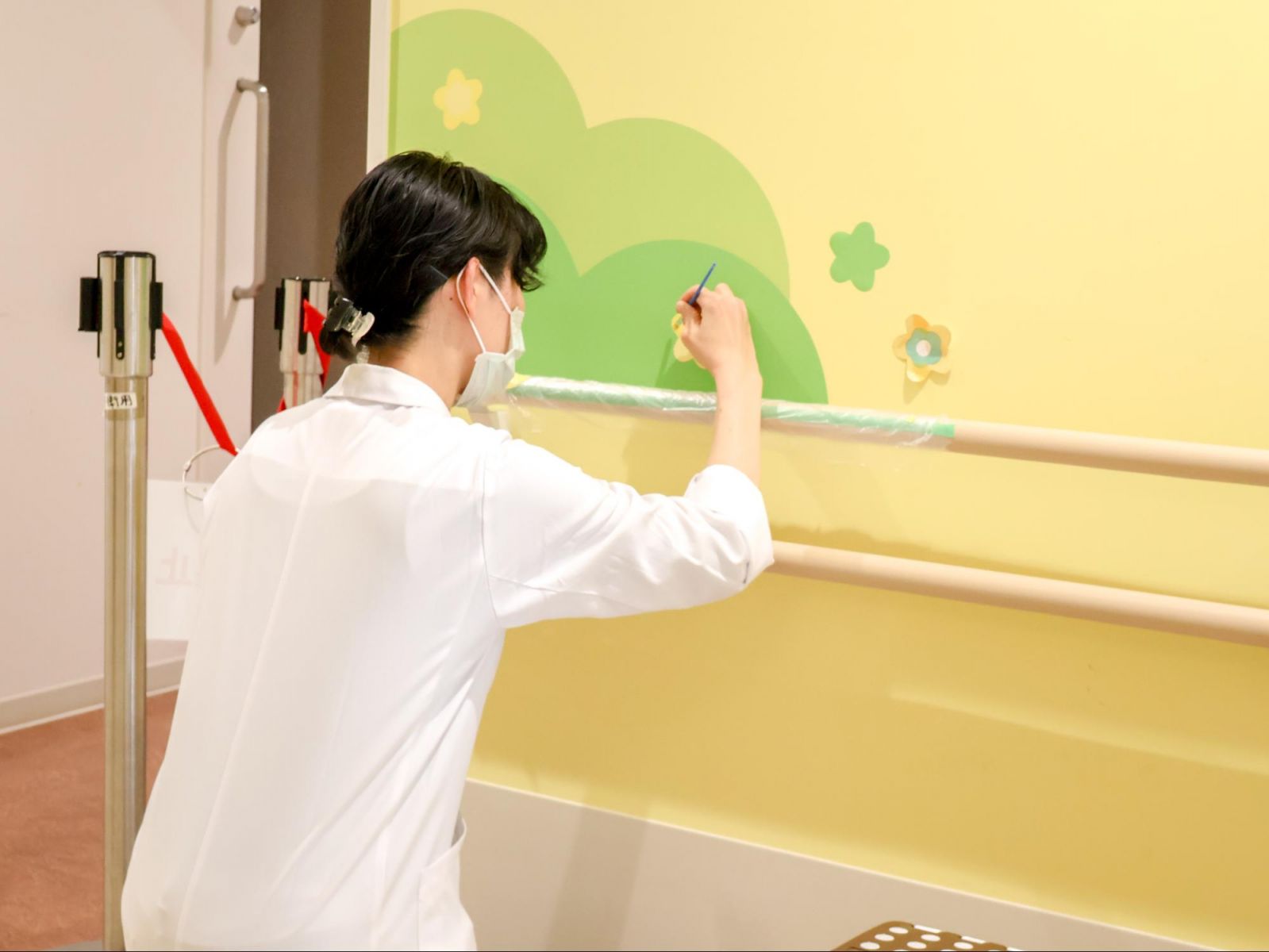 —たしかに、北野病院では抽象的な形が多く、意味が広く受け取れるモチーフでしたが、急性期・総合医療センターでは愛らしい動物たちをはじめ、具体的なモチーフもたくさん登場しますね。稼働中の病棟での施工でしたが、描いている中で感じたことはありますか?