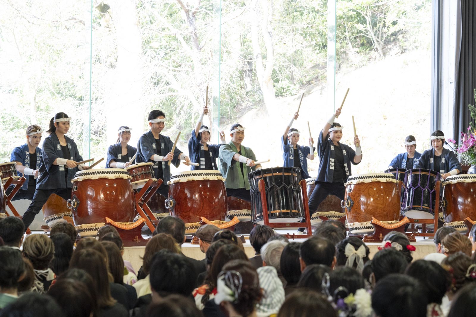 そして祝辞が締めくくられ、その後、学生サークル「和太鼓 悳(しん)」が祝奏「弾(だん)」を披露しました。それぞれ違った軌跡を辿り、今この日を迎えた卒業生。卒業という新たな門出を迎えられる今日の日に、力強い和太鼓の音色が講堂に響き渡ります。ひとつひとつの音が心に重く伝わり、背中を力強く押してくれるような演奏でした。