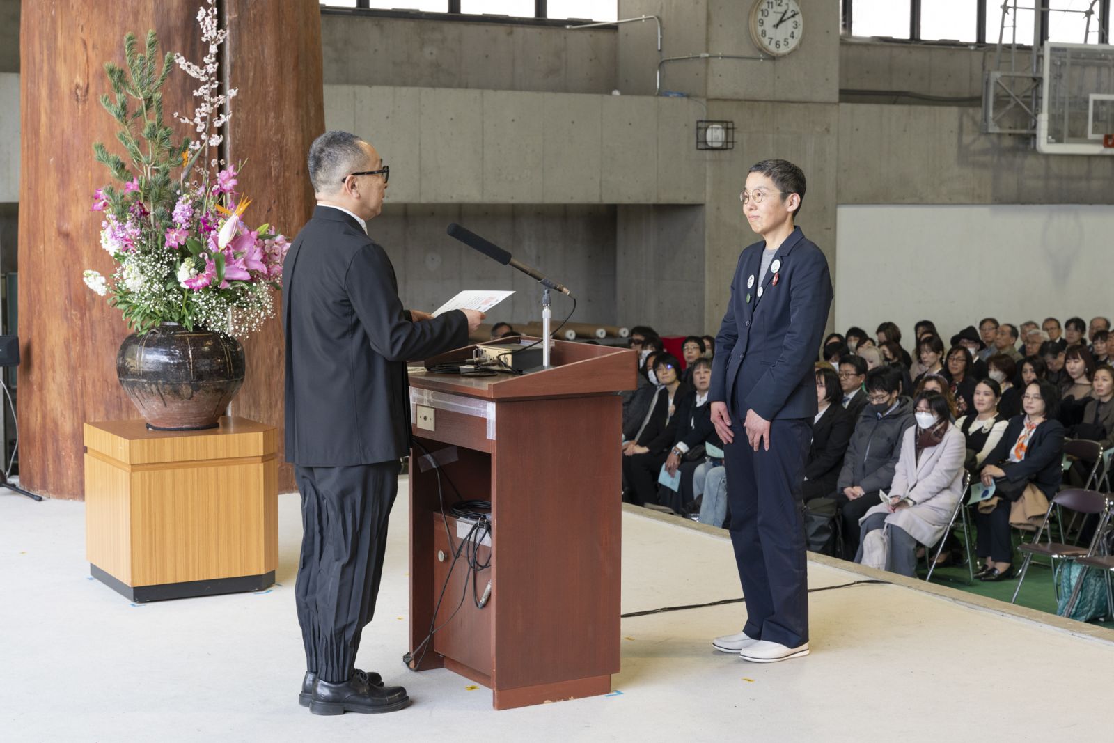 「どうしてそこまでして学ぶのかと周囲に問われたかもあったかもしれません。しかし、その問いに対し、みなさんは自らの作品と、今日という日をもって、見事に答えを出されました。本当におめでとうございます。生活と芸術、クリエイティブを切り離すのではなく、生活の中にクリエイティブを力ずくで手繰り寄せてきた。その学びの筋力みたいなもの、それがきっと最大の財産なんじゃないでしょうか」
