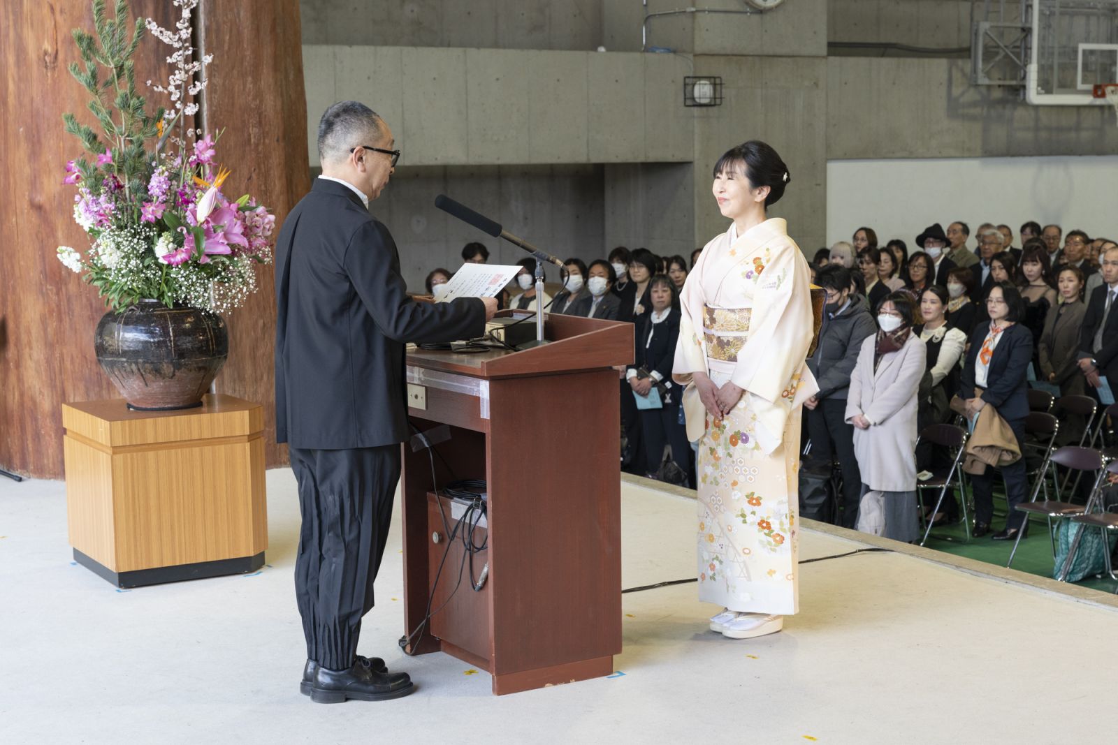 通信教育課程の卒業生にとって、卒業式は共に切磋琢磨した仲間と顔を合わせる貴重な機会となります。久しぶりに会う学友と話を弾ませながら入場を終えた後、開式の辞と共に、式典が始まります。