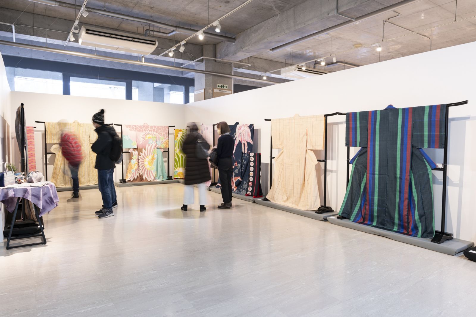 本学の大階段を上り、人間館へ入ると、さっそく展示されているのは、美術科 染織コースの卒業制作です。人間館の1階カフェラウンジの広い空間や、そこへ差し込む日の光を活かした展示がされていました。