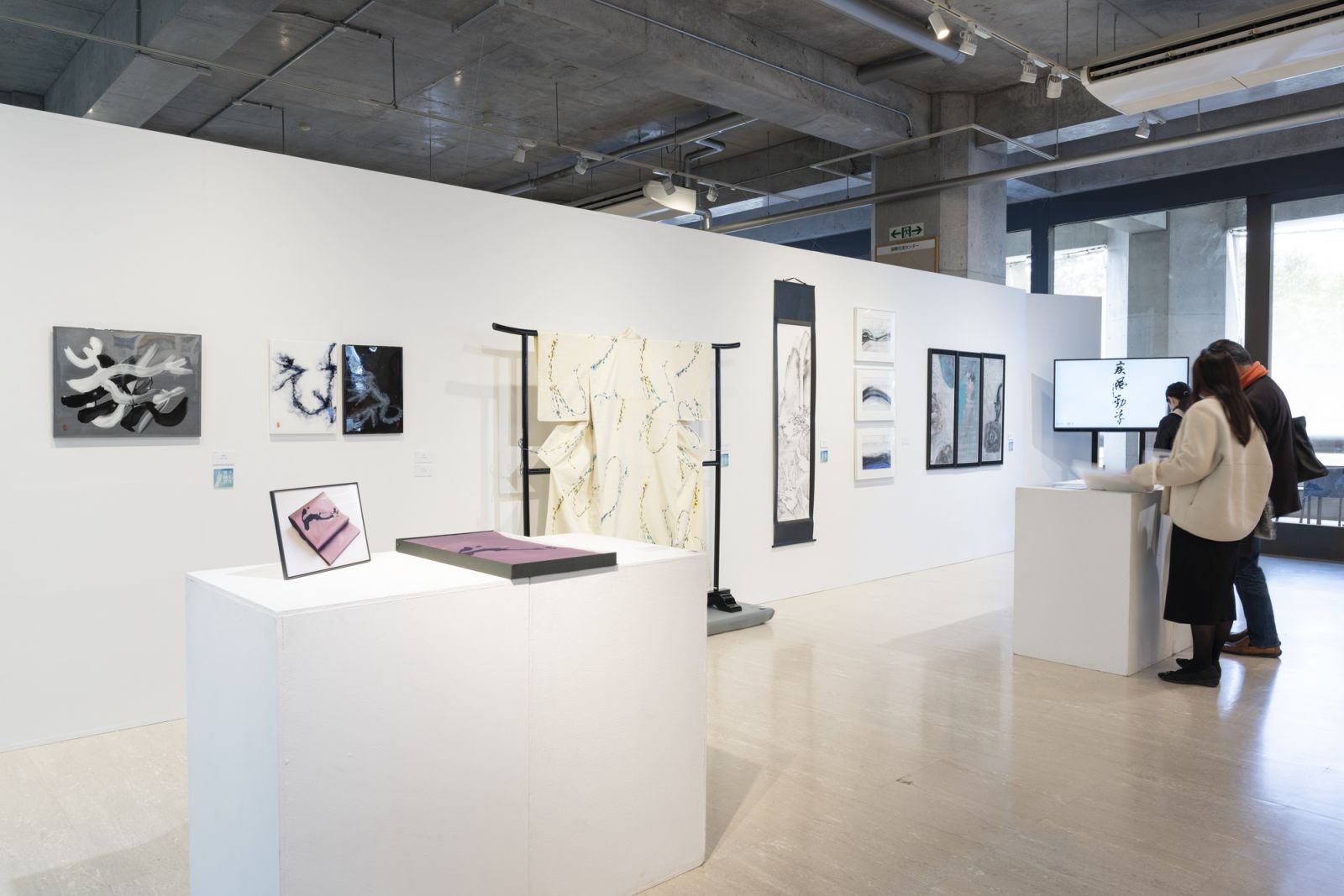さまざまな形態で見せられる筆の動きが印象的な展示。カフェを訪れた人も足を止め、展示を眺める様子がうかがえました。