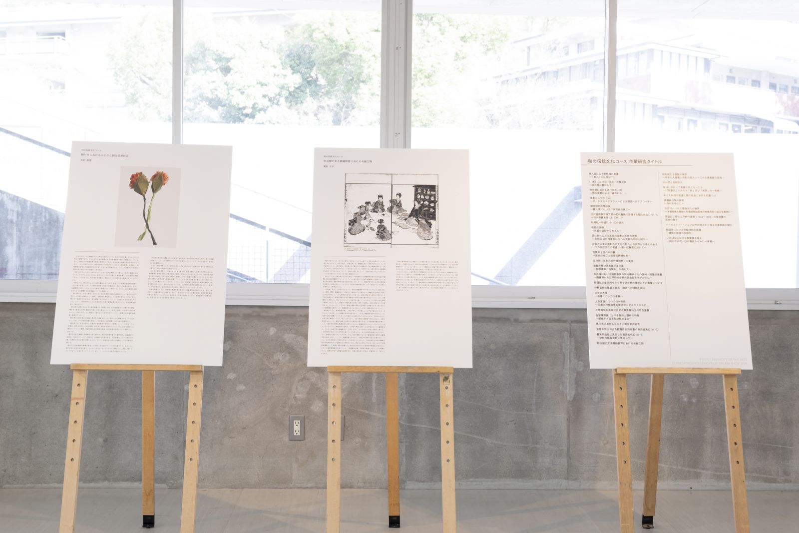 芸術学科では、人間館4階の教室を使ったパネル展示が行われました。設置された椅子に座り、研究を熟読するお客さんも。学生たちの好奇心、日々の研究の成果が披露された展示です。
