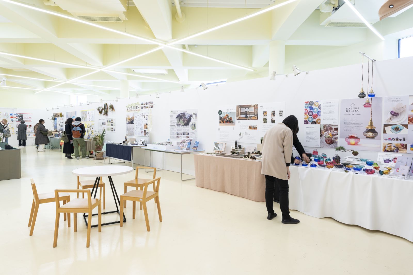 こちらは、今年度、空間演出デザインコースの学科賞を受賞した黒沼悠里さんの作品「KABURA KIRIKO 切子ガラスの廃棄副産物に伝統と未来を宿す」(写真右端)です。