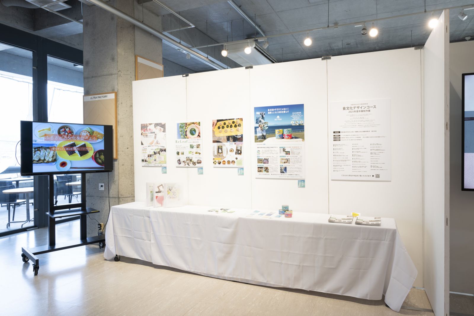 食を「ライフデザイン(文化・社会)」、「ビジネスデザイン(プランニング・プロデュース)」「体験デザイン(理論・感性)」の3つの側面から領域横断的に学ぶ、文化コンテンツ創造学科 食文化デザインコースは、今年度の展示がコース初の卒業制作展示となりました。パネルでの研究紹介のほかに、ポートフォリオが展示され、じっくりと研究や活動の過程を知ることができます。